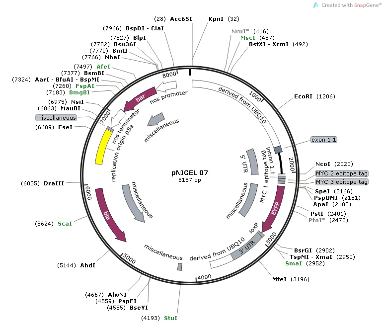 Wave DNA line, a subcellular marker line with spectrally distinct, fluorescent fusion construct providing localization to the vacuole. The construct is under the control of thepUBQ10 promoter. Based on the pNIGEL recombination vector pNIGEL 07 a fusion construct was generated using an ORF clone from the SSP consortium. The marker constructs are available in four colors Blue (mCerulean), Bluegreen (mTFP1), Yellow (YFP) and Red (mCherry). this construct utilizes the yellow fluorescent marker (YFP)