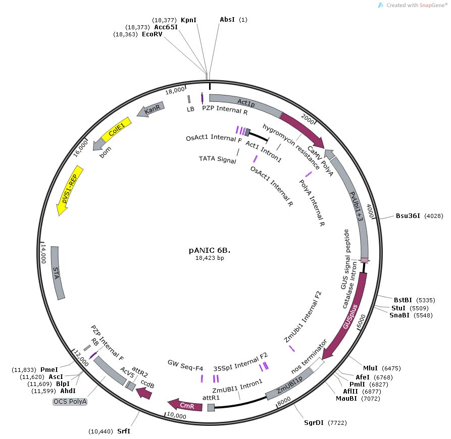 Gateway-compatible destination vector suitable for overexpression of genes of interest using Agrobacterium-mediated transformation of higher plants, particularly monocot species. Vector contains hygromycin selection under the control of a constitutive rice actin promoter, a GUSPlus visual marker, and Gateway cassette driven by a maize ubiquitin 1 promoter and intron for overexpression of target genes.